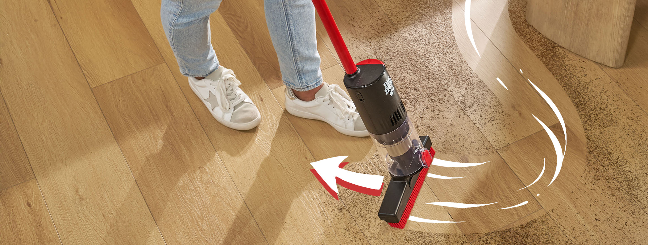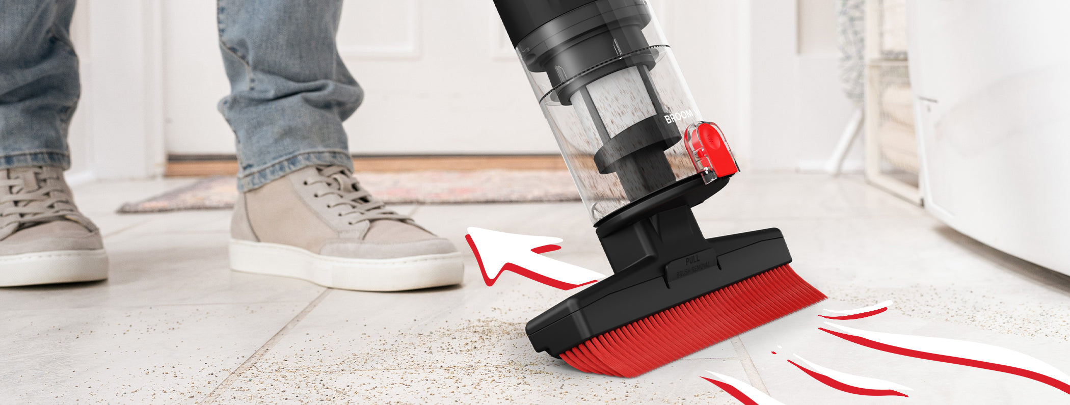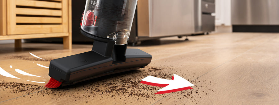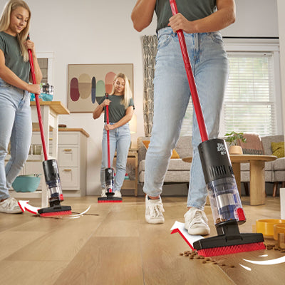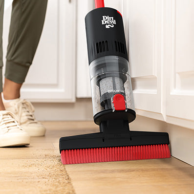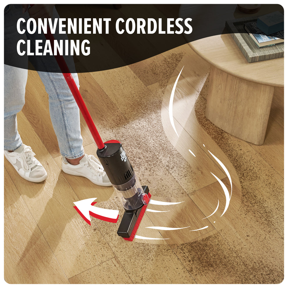 Ease of a broom with the convenience of a vacuum – no dustpan required.