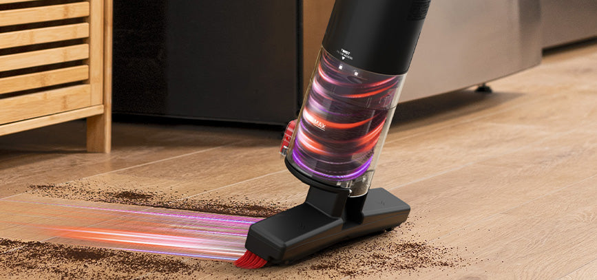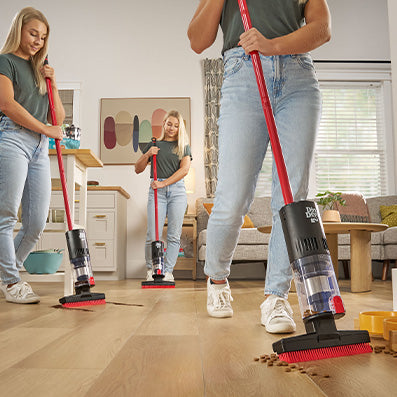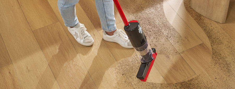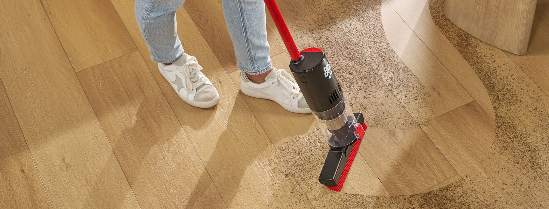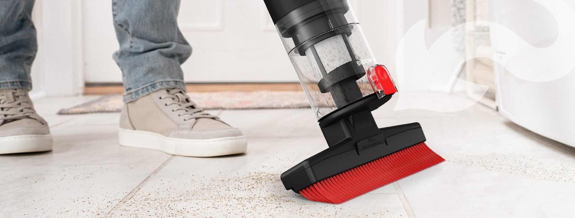 Ease of a broom with the power of a vacuum – no dustpan required.
