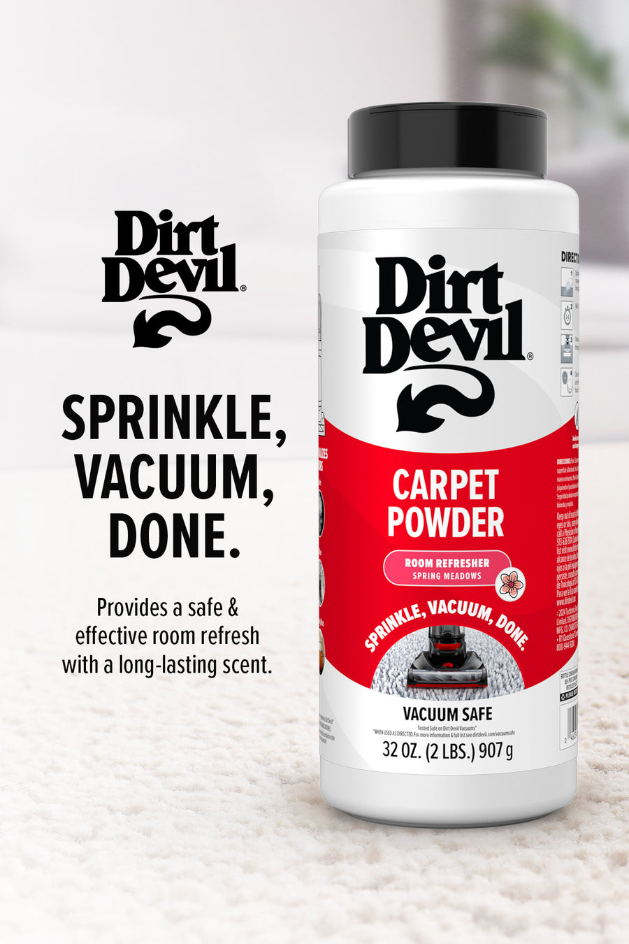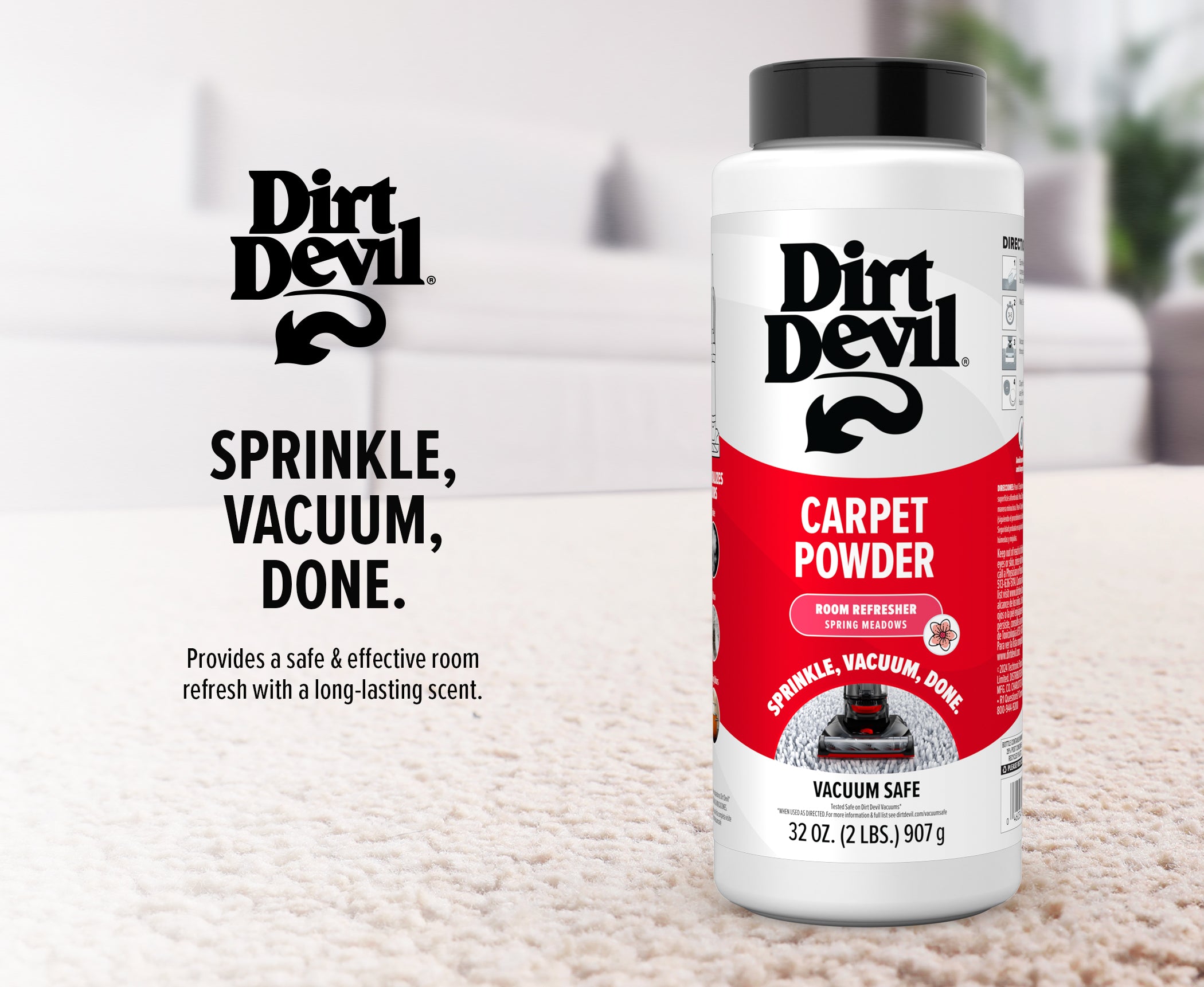 Sprinkle over the carpeted surface evenly, wait 5 minutes and vacuum up.