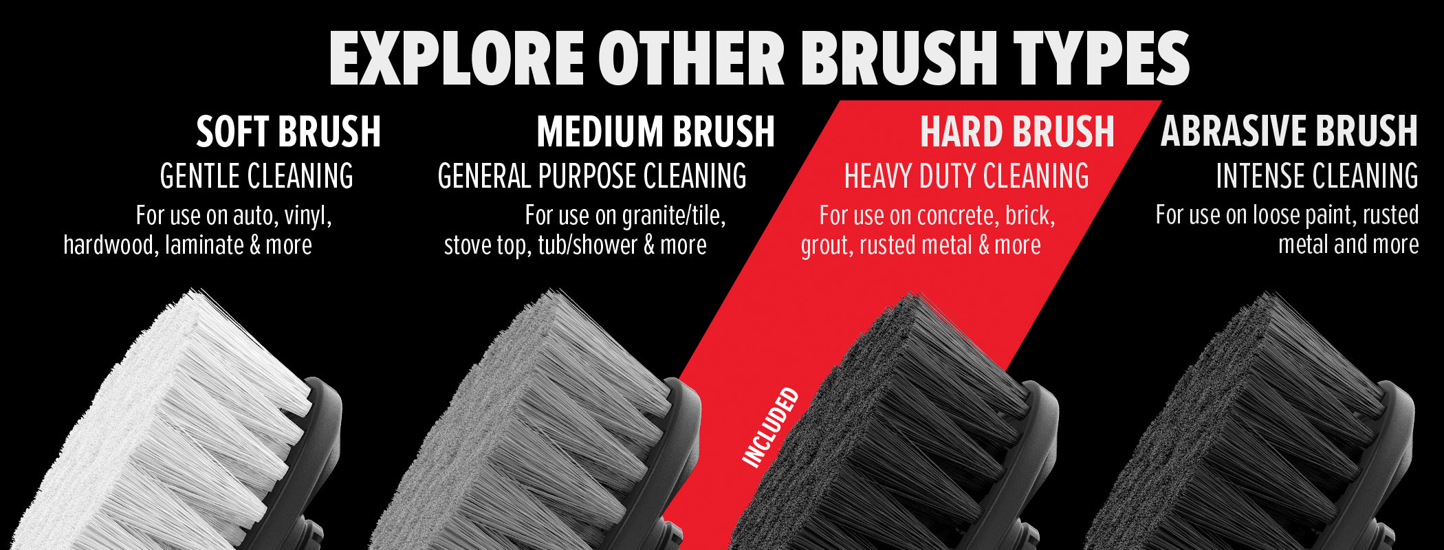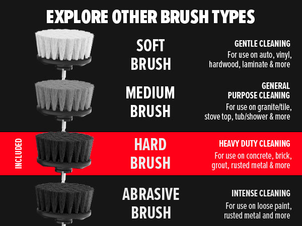 The hard brush is ideal for removing even the most stubborn stains and dirt from surfaces like brick, grout, cast iron, concrete and more.